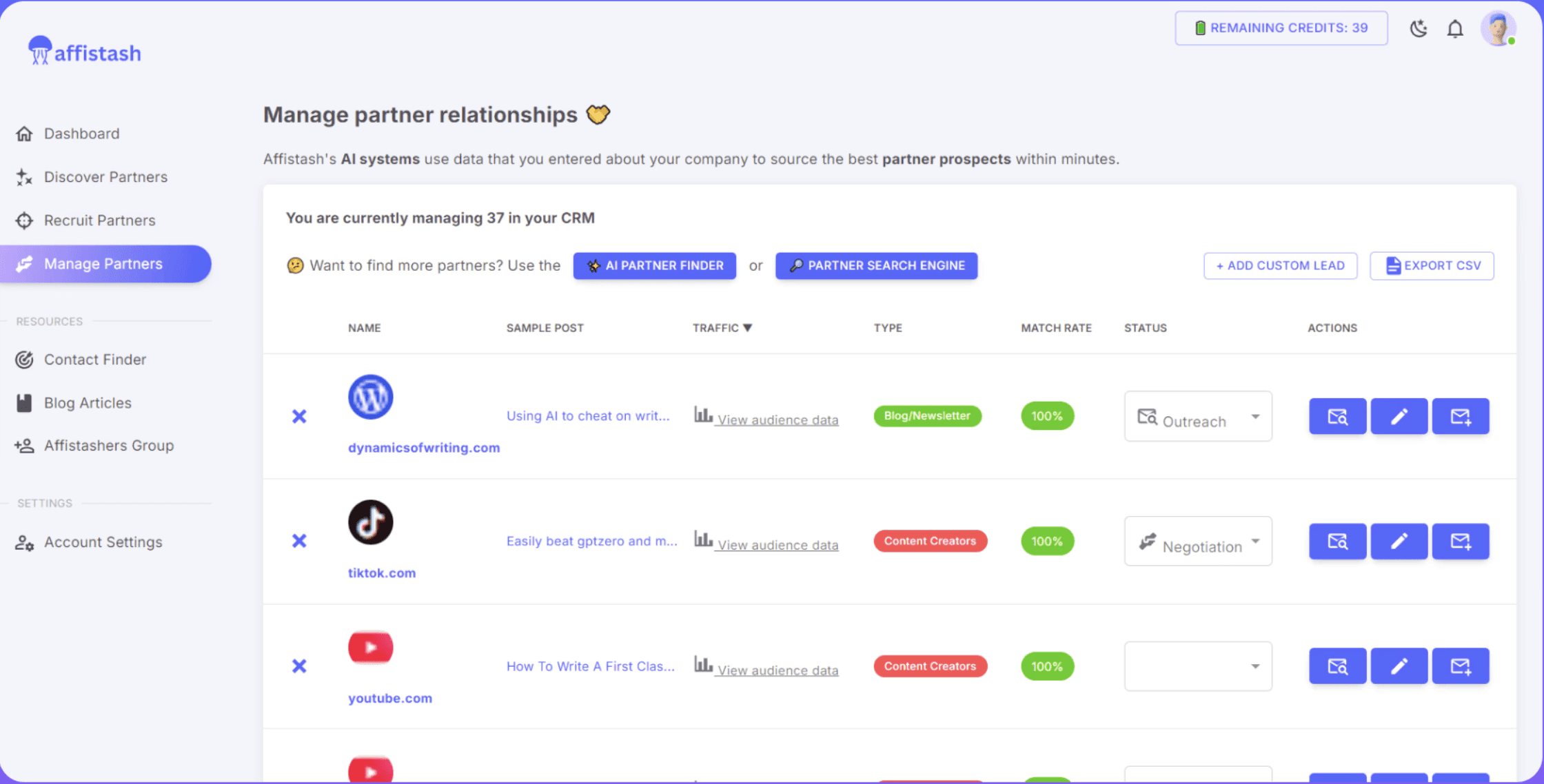 Affistash works similarly to Alfie. The tool crawls the web to find publishers, bloggers, review sites, influencers, and niche communities that would be a strong fit for your SaaS product.